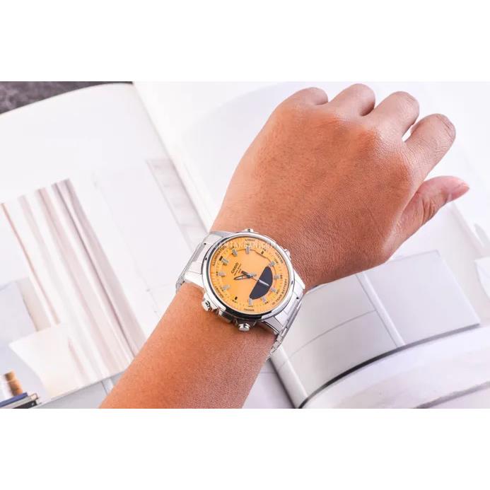 Casio AMW-880D-9AVDF با قاب و بند استیل ضدزنگ، صفحه ترکیبی و مقاومت آب ۵۰ متر، ساعتی مقاوم و دقیق برای استفاده روزمره و ورزشی.